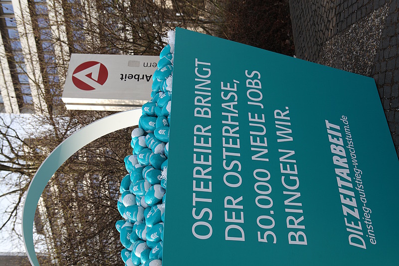 März 12 - „Ostereier bringt der Osterhase, 50.000 neue Jobs bringen wir“, so das Motto des Bundesarbeitgeberverbands der Personaldienstleister (BAP). Mit einem außergewöhnlichen Osterkorb, direkt platziert vor dem Verwaltungsgebäude der Bundesagentur für Arbeit (BA), gewann der Verband die Aufmerksamkeit der Journalisten. Diese waren zur monatlichen Pressekonferenz unterwegs, um die neuesten Arbeitslosenzahlen zu erfahren. „Die Nachfrage ist immer noch hoch. So lange die Konjunktur gut ist, nutzen die Firmen gerne die Zeitarbeit, um Mitarbeiter zu finden und zu übernehmen. Darum sehe ich momentan noch wirklich gute Chancen für Arbeitsuchende“, sagt Ingrid Hofmann.