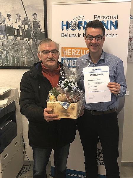 Januar 18 - „Wechselnde Einsätze über 20 Jahre, stets ein Lächeln im Gesicht und immer Spaß an der Arbeit gehabt – so kennen wir Joachim Schmidt, der uns nun leider verlässt“, bedauert Niederlassungsleiter Christian Schneider. „Das Hofmann-Team wünscht alles Gute für die private und berufliche Zukunft. Und vielen Dank für eine tolle gemeinsame Zeit!