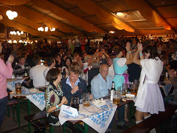 Recht schnell hieß es dann auch von der Band „Die wilden Buben“: „Die Krüge hoch! Ein Prosit der Gemütlichkeit ...“ Sie spielten klasse und ohne große Unterbrechungen einen Oktoberfesthit nach dem anderen. Auch unsere Mitarbeiter blieben nicht lange sitzen und so tanzten spätestens ab 18 Uhr alle auf den Bänken und feierten ein „zünftiges“ Oktoberfest. Bis 23 Uhr wurde gesungen, getanzt, getrunken und viel gelacht.