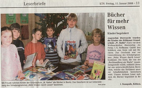 Januar 08 - Kinder lesen zu wenig, heißt es immer. Doch wer führt sie an gute Lektüre heran und unterstützt sie? „Dieses Schulprogramm „Mehr Wissen durch Lesen“ ist eine prima Idee“, erzählt Niederlassungsleiterin Cornelia Schröter. „Darum haben wir uns gerne daran beteiligt.“ Mit einer Kiste voller ausgesuchter Bücher besuchte sie die Grundschule und übergab sie den Kindern. Ein guter Schritt, um die Schul- bibliothek weiter wachsen zu lassen.