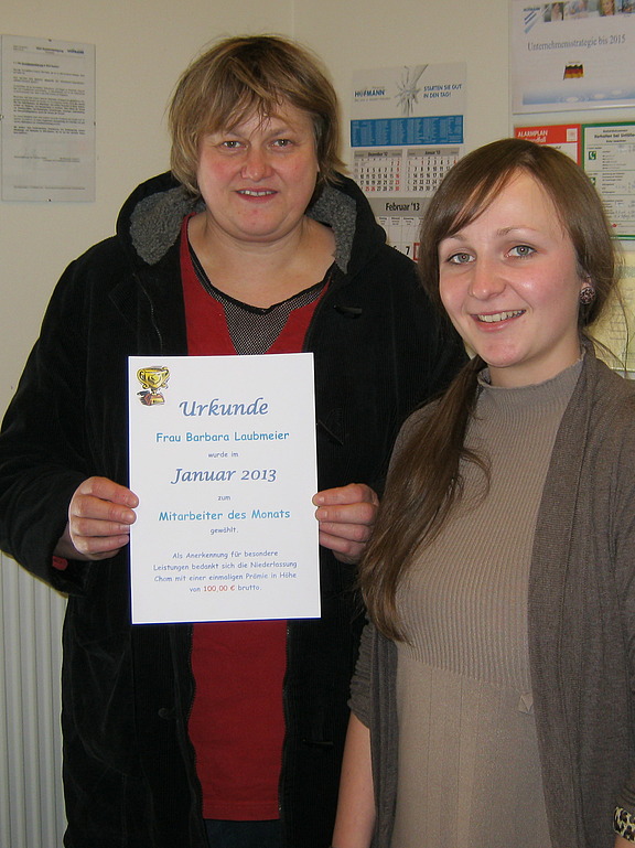 Januar 2013 – Das Jahr 2013 startet für Barbara Laubmeier besonders gut, denn sie wurde im Januar vom Hofmann-Team zur ersten Mitarbeiterin des Monats gekürt. Über diese besondere Auszeichnung, verbunden mit einer Geldprämie, freute sie sich besonders: „Davon werde ich mir persönlich jetzt etwas ganz Besonderes leisten!“ bemerkte sie beim Erhalt der Urkunde.