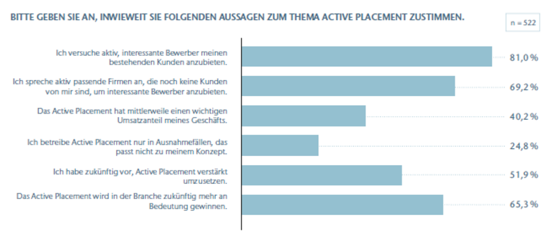 - Fokus der diesjährigen Studie ist Active Placement, also der proaktive Vertrieb passender Kandidatenprofile an Bestands- sowie Neukunden. 1.000 potenzielle Kandidatinnen und Kandidaten, 1.152 Unternehmen und 531 Personalvermittler haben an der Studie teilgenommen. Die daraus gewonnenen Erkenntnisse bilden Trends und Entwicklungen von Recruiting-Themen ab.