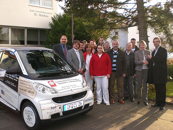 November 08 - Mit einem kleinen Umtrunk bedankte sich das Team der Caritas Sozialstation Rüsselheim/Kelsterbach bei den Sponsoren eines Smart, mit dem die Caritas-Mitarbeiter künftig ihre Patienten aufsuchen werden. Mitte November konnte die Leiterin der Sozialstation Barbara Hoek den PKW-Schlüssel entgegen nehmen. An dem Sponsoring beteiligt hatten sich insgesamt 25 Unternehmen