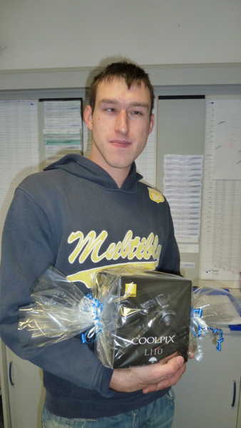 November 10 – Ein Anruf aus der Niederlassung – gutes oder schlechtes Zeichen, fragte sich Steffen Krahl. Doch sein Gefühl sagte ihm, dass es eine gute Nachricht sein würde. Er hatte Recht, denn Niederalssungsleiter Jan Fiedler konnte ihm mitteilen, dass er bei der Jubiläumsverlosung in diesem Monat die Digitalkamera gewonnen hatte. Steffen Krahl, von Natur aus sowieso schon ein fröhlicher Mensch, freute sich mächtig darüber. „Das ist doch mal eine wirklich nette Überraschung für Herrn Krahl“, findet auch Sabine Bechert, die seine offene Art und seine Einsatzbereitschaft sehr schätzt. „Gelegenheit zum Fotografieren gibt es ja genügend, zumal das Weihnachtsfest vor der Tür steht“, ergänzt sie schmunzelnd.