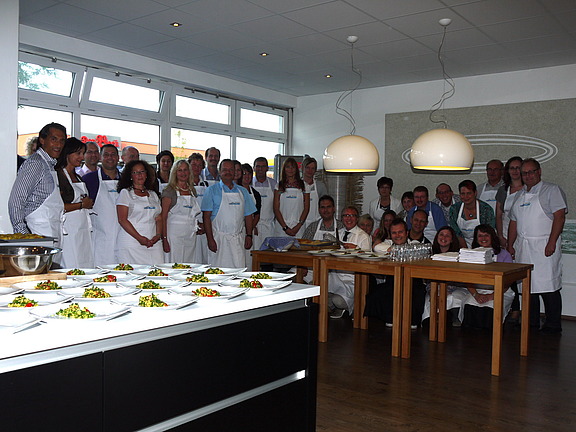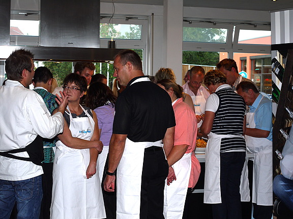 Mit einem Shuttle-Bus ging es Richtung Fürth in die Kochakademie, wo Regionalleiterin Brigitte Schneider die Gäste herzlich begrüßte. Anschließend übernahm Ralf Mackert die Regie. Nach dem Genuss einer vom Chef persönlich zubereiteten Vorspeise wurden die Teilnehmer in zwei Gruppen aufgeteilt: Die eine Gruppe nahm an einer Weinverkostung teil, während die zweite unter Anleitung den Hauptgang auf die Teller zauberte. Danach wurde getauscht – wer vorher gekocht hatte, durfte nun die guten Tropfen verkosten. Somit war der Abend ausgefüllt mit probieren, kochen, schlemmen, lachen und ein wenig lernen – bis es kurz vor Mitternacht wieder zurück nach Neustadt ging.