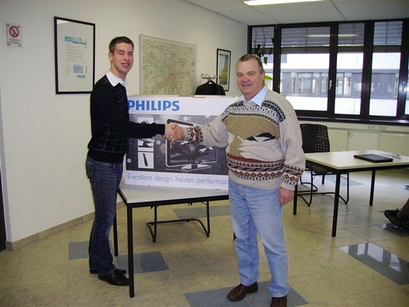 März 2011 - In der letzten Mitarbeiterzeitung hatten wir alle Hofmann-Mitarbeiter dazu eingeladen, an unserem Jubiläums-Gewinnspiel im Extranet teilzunehmen, das über’s Jahr verteilt fast jeden Monat stattfand. Hochwertige Preise gab es zu gewinnen, darunter einen Flachbildfernseher, einen Laptop, eine Digitalkamera, eine Wii-Konsole …. Insgesamt zehn Mitarbeiter aus unterschiedlichen Niederlassungen gewannen, darunter Udo Pörschmann aus der Niederlassung Leipzig. Er gewann den Flachbildfernseher.