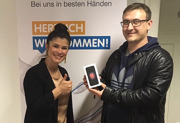 April 18 – Noch nie hatte er irgendetwas gewonnen, doch diesmal hatte Artur Schabalin Glück. Bei unserem Gewinnspiel zur Einführung unserer Mitarbeiter App wurde er ausgelost und gewann das neue i-phone SE. Herzlichen Glückwunsch und viel Spaß damit!