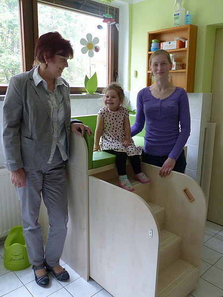 Juli 17- Mit großer Fürsorge werden die zwölf Kinder zwischen dem ersten und dritten Lebensjahr in der KITA Alter Steinweg versorgt. Um den Erzieherinnen den Alltag ein wenig zu erleichtern, spendete das Hofmann-Team eine Wickelkommode mit Stufenpodest im Wert von 1250 Euro. „In dieser KITA werden vor allem Eltern unterstützt, die gerne Beruf und Familie vereinbaren wollen. Diese sehr gut geführte Einrichtung sorgt dafür, dass sie dies mit gutem Gewissen tun können. Und das unterstützen wir sehr gerne“, sagt Büroverantwortliche Evelyn Kessler.