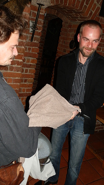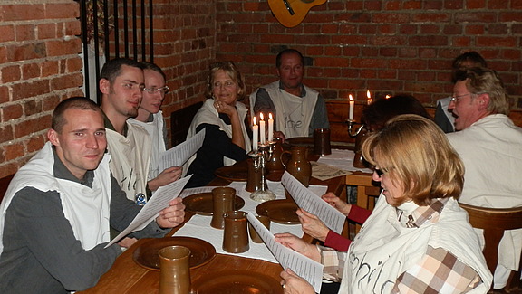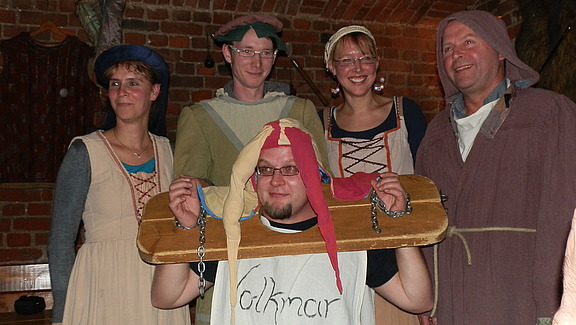 Anschließend übten sich die in historische Gewänder gekleideten Gäste in rustikalen Tischmanieren – wer kannte damals schon Messer und Gabel? Wie im Mittelalter üblich, gab es zwischen den einzelnen Gängen den wohlbekannten Minnegesang. Nicht jedoch von einem Chor, mitnichten. Vielmehr durfte jeder Gast eine Strophe des Ritterliedes „Ja so warn’s die alten Rittersleut“ zum Besten geben - was für umfassendes Gelächter sorgte. Mit dem Gesang allein war es jedoch nicht getan. So wurde manch überliefertes Ritual nachgespielt: Stefan Lang fand sich in einer Halsgeige wieder - umringt von seinen Burginsassen. Zimperlich war an diesem Abend jedenfalls niemand.