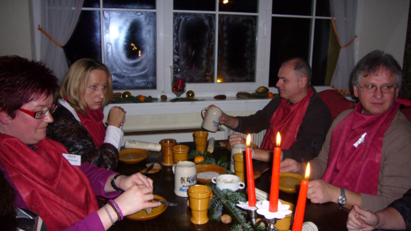 In diesem Jahr gab es strenge Tischregeln zu beachten! Die Damen der Runde hatten die Herren zu bedienen. Ein Mann, der sich selbst sein Essen auf den Teller schöpfte, wurde sogleich an den Pranger gestellt. Hier konnte er nur durch mutiges Erfüllen der schwierigen Aufgaben wieder befreit werden.