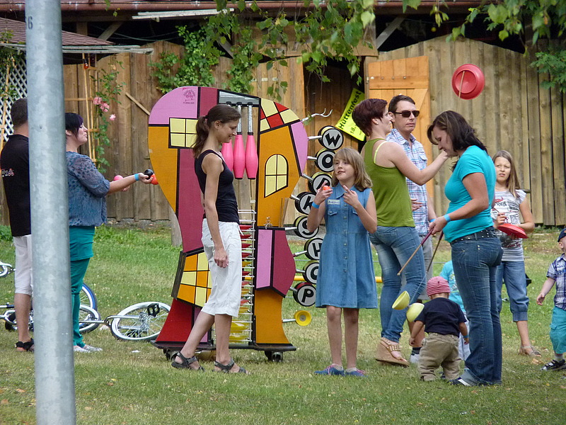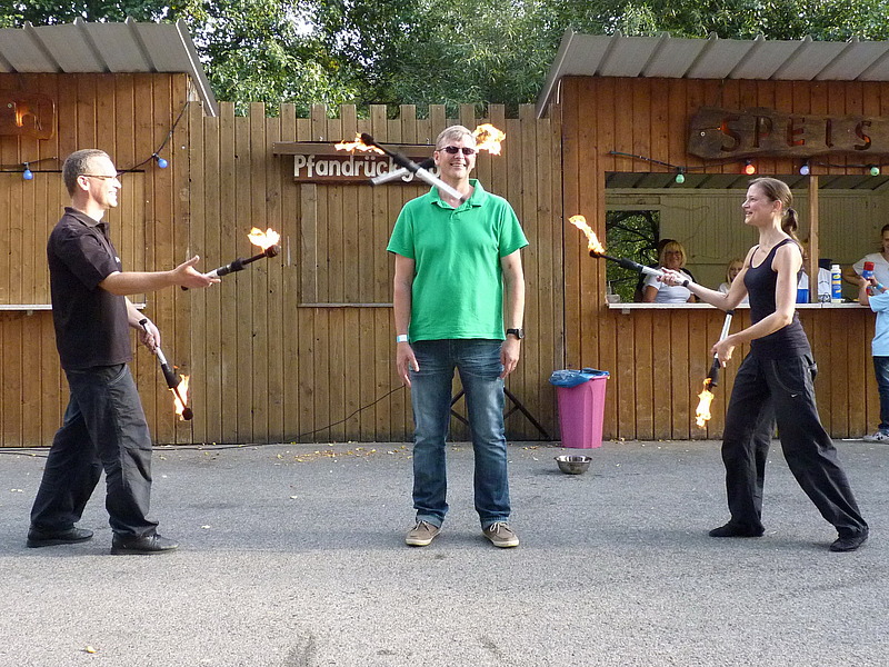 War der Tag schon ereignisreich genug, wurde es am Abend auch nicht langweilig: die Jonglage-Trainer der Gruppe Firlefanz schwenkten in einer halbstündigen Show ihre Keulen und zogen die Zuschauer mit außergewöhnlichen Formationen in ihren Bann. Ein Lagerfeuer zu später Stunde sorgte für angenehme Atmosphäre und so trat der „harte Kern“ erst gegen 23 Uhr den Heimweg an.