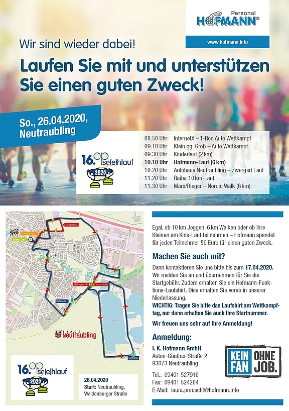 März 2020 – Jedes Jahr sind wir dabei und laufen im Rahmen des Hofmann-Spendenmarathons für einen guten Zweck. Wir hätten Sie gerne eingeladen, mit uns zu laufen! Doch leider wird der Lauf aufgrund der wohl allen bekannten Situation nicht stattfinden. Das bedauern wir sehr! Alle Gute an Sie alle und bleiben Sie gesund!