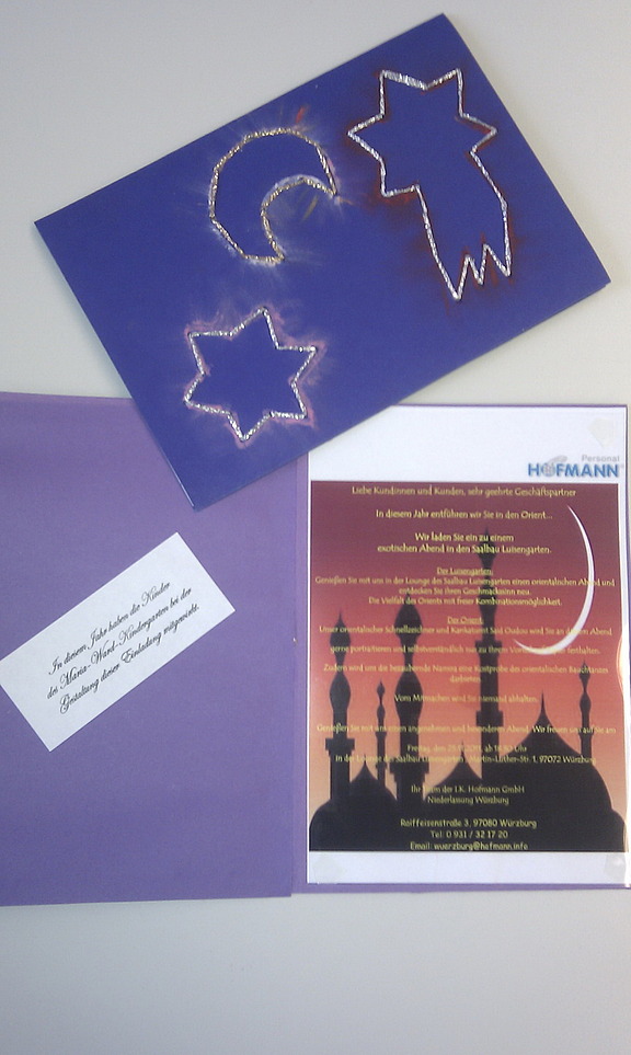 Diese waren mit Feuereifer dabei, ließen ihrer Kreativität freien Lauf und bastelten - passend zum Veranstaltungsmotto „Orientalischer Abend“ - wunderschöne Einladungen. „Die Karten sind alle Unikate, versehen mit dem Namen des Kindes, das sie gebastelt hat. Manch einer hat die Einladungskarte auf seinem Schreibtisch stehen!“, freut sich Gerhard Zall. „Und natürlich wollten wir uns für dieses tolle Engagement bedanken.“