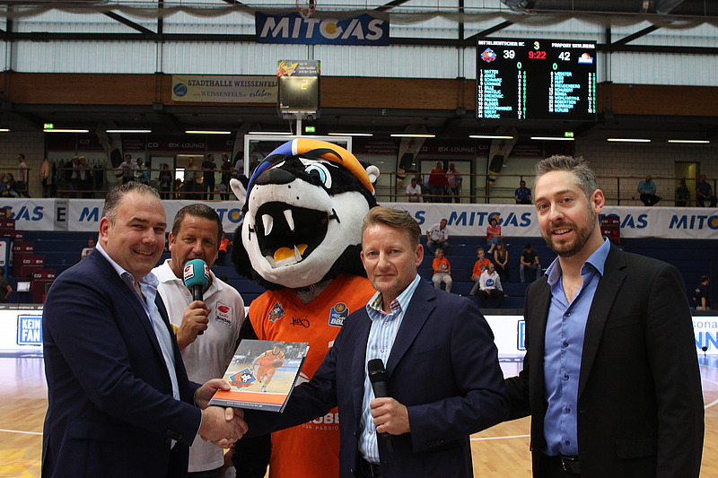 Er überreichte beim Spiel gegen Fraport Skyliners während der Halbzeitpause die Sponsoringvereinbarung an Jörg Hexel (Sprecher des MBC Beirates) und Stefan Schedler (Marketingleiter) und stellte den interessierten Zuschauern und Zuhörern von Radio Brocken unser Unternehmen und unsere Kampagne Kein Fan ohne Job vor.