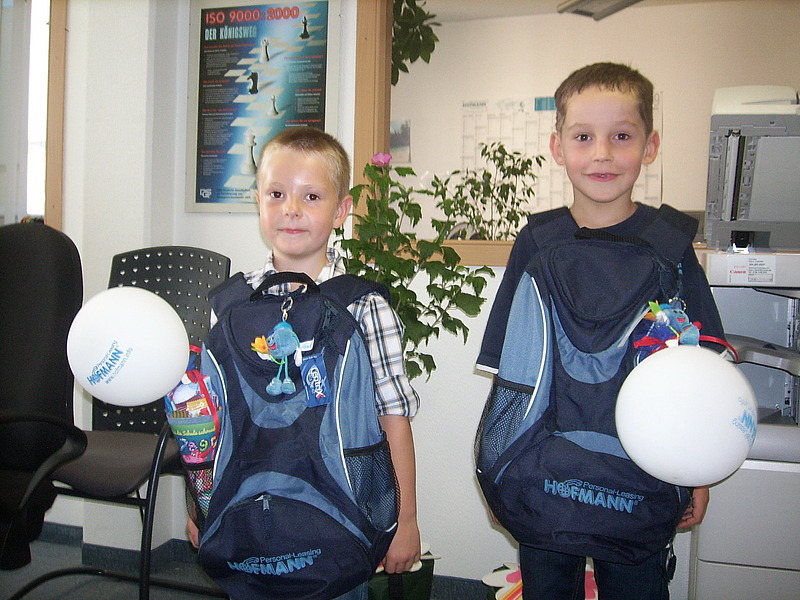 August 09 - Was sagte doch Einstein? „Die Schule soll stets danach trachten, dass der junge Mensch sie als harmonische Persönlichkeit verlasse, nicht als Spezialist.“ Moritz Hohmann und Marcel Königsmann werden die Schule bereits als kleine fröhliche Persönlichkeiten betreten. Sie sind mächtig stolz, dass es nun endlich so weit ist. Zum Schulstart gab es vom Hofmann-Team ein paar kleine Geschenke einschließlich gefüllter Schultüte. „Und selbstverständlich wünschen wir den beiden, dass sie so zuversichtlich bleiben und auch etwaige Misserfolge gut wegstecken.“ meint die Niederlassungsleiterin Christine Kochan schmunzelnd.