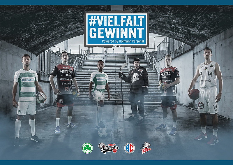 Hofmann Personal und die Partnervereine HC Erlangen, Nürnberg Falcons, SpVgg Greuther Fürth und THOMAS SABO Ice Tigers starten heute gemeinsam die Initiative „Vielfalt gewinnt“, um ein klares Zeichen für ein gutes Miteinander und gegen jede Art von Diskriminierung, Ausgrenzung und Rassismus zu setzen.