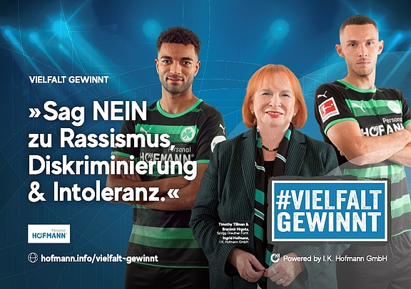 Wir machen die Brust frei – und setzten damit erneut ein Zeichen. „Ob im Sport, in der Gesellschaft oder in der Arbeitswelt: Vielfalt gewinnt! Wir beschäftigen Menschen aus über 100 Nationen, die erfolgreich miteinander arbeiten und unsere Überzeugung widerspiegeln bzw. leben. Wir freuen uns, gemeinsam mit der SPVGG GREUTHER FÜRTH diese Botschaft auch in der Bundesliga nach außen tragen zu können“, sagt Ingrid Hofmann.