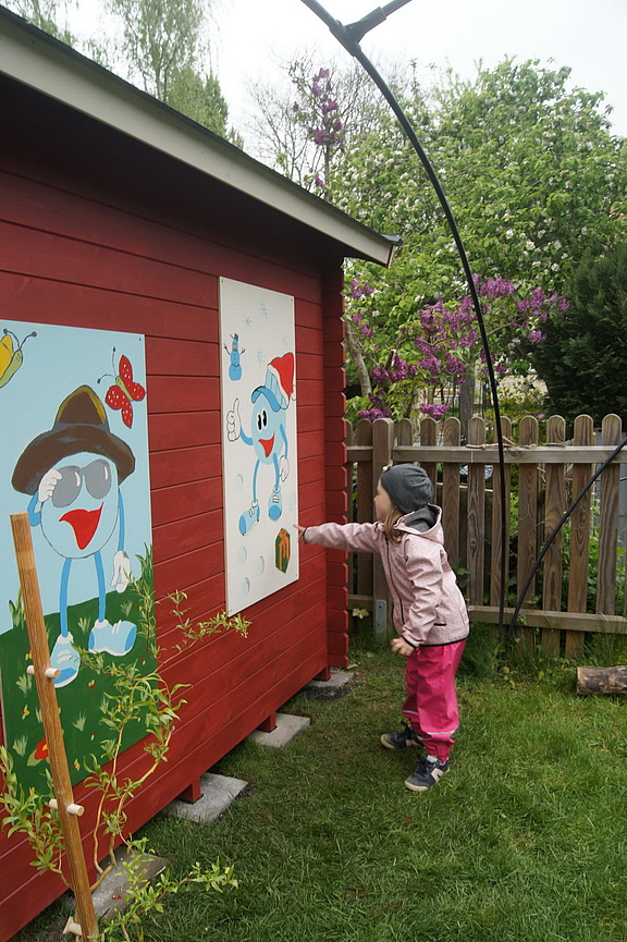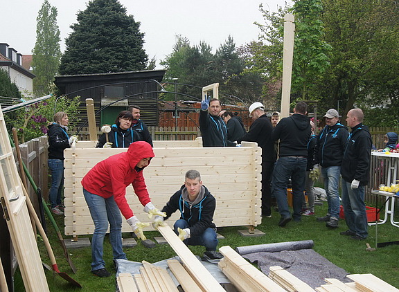 Wie beim klassischen Hausbau entstanden nacheinander Fundament, Rohbau und Dach. Türen und Fenster wurden eingebaut, der Fußboden gelegt und alle Teile fest miteinander verschraubt. Die Flächen bekamen einen bunten Farbanstrich und als optisches Highlight zierten vier spontan selbst gestaltete Bilder des Hofmann-Firmenmaskottchens „Jobby“ im Design der vier Jahreszeiten die Wände. Und nachdem alles fertig war, konnte diese einzigartige Gartenlaube an seine neuen Nutzer übergeben werden.