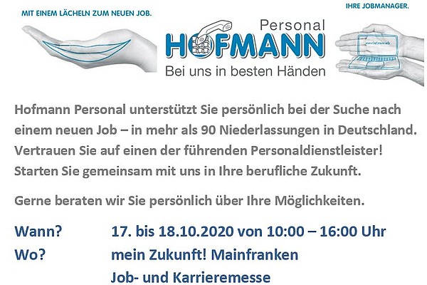 Hofmann Personal ist bei der Würzburger Job- und Karrieremesse im Vogel Convention Center am 17./18. Oktober 2020 dabei