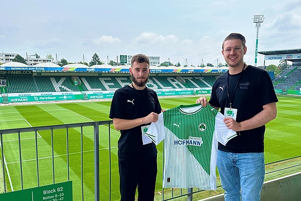 Azubi der Niederlassung Fürth, Feliciano Angerer, erhält Originaltrikot der SpVgg Greuther Fürth.