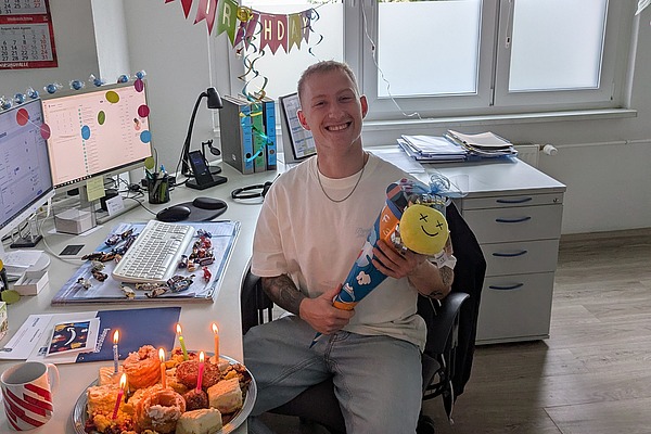 Azubi Jonas Raap feiert Ende der Ausbildung, Übernahme von Hofmann Personal und Geburtstag an einem Tag.