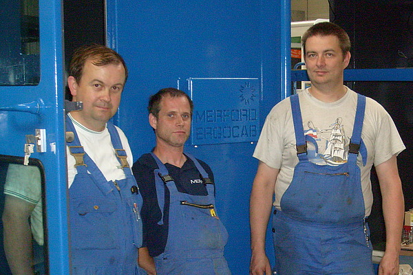 Die Mitarbeiter Heiko Pasch, Jens Scheibel und Frank Tauber absolvieren ihre Arbeitseinsätze u.a. bei dem Krankabinenbauer Merford B.V. Produktie in…
